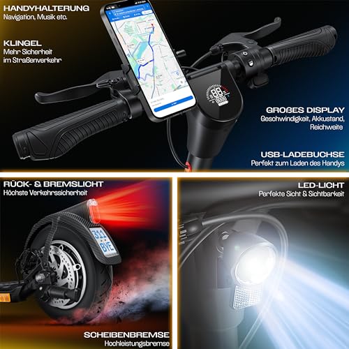 En matière de sécurité, le scooter électrique KESSER® est homologué pour la circulation, équipé de systèmes de freinage de haute qualité avec un frein à tambour à l’avant et un frein à disque à l’arrière, complétés par un feu arrière, un feu de freinage et un phare puissant pour une visibilité maximale. L’écran LCD intégré affiche toutes les informations importantes, comme la vitesse, le niveau de batterie et le kilométrage, tandis qu’un support pour smartphone permet de garder vos appareils à portée de main.
