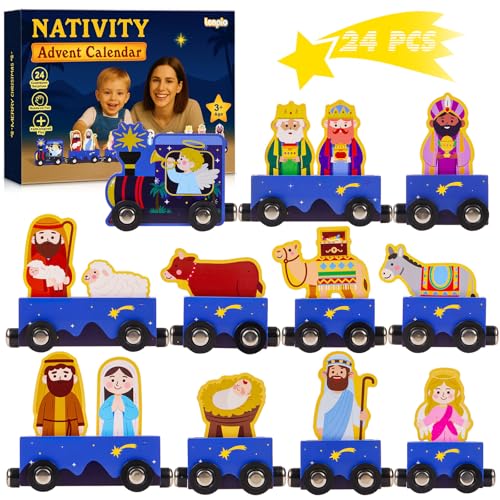 Nativity Advent Calendar 2025 Kids, 24 Days Wooden Nativity Train Set, Toddler Christmas Nativity Play set, Unique Christian Xmas Countdown Gifts for Children Baby Boys & Girls