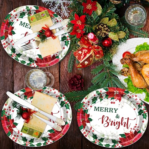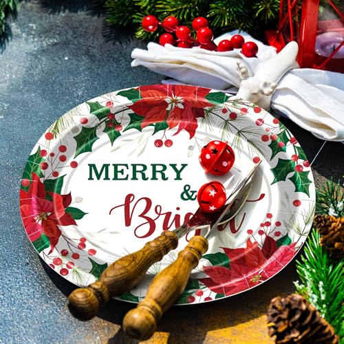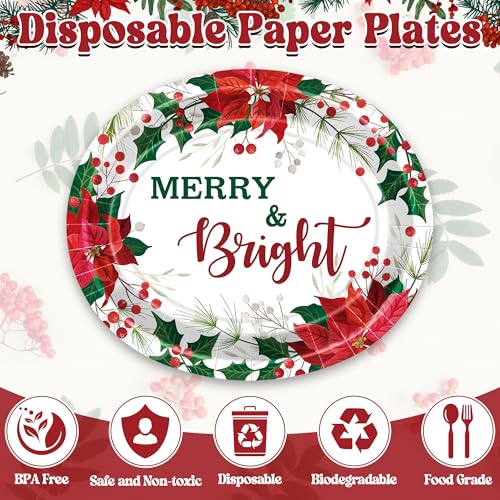 QZYL 50 PCS Christmas Plates, 12.2″ × 10.2″ Oval Christmas Paper Plates, Poinsettia Holly Berries Design Disposable Plates, Xmas Tableware Xmas Party Supplies Festive Table Decor
