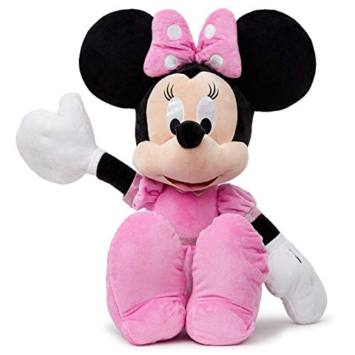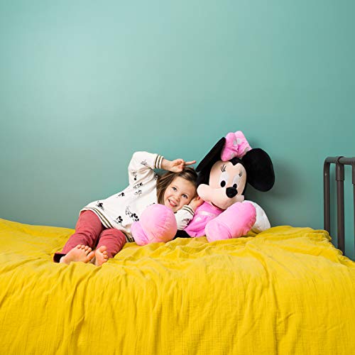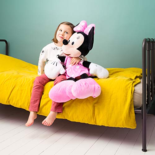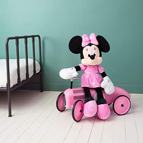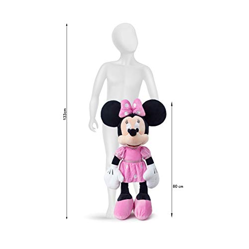 Peluche Minnie 80 cm. La robe est rose à pois blanc. Les chaussures sont roses. Peluche parée d’un facile nœud rose à pois blancs sur la tête.