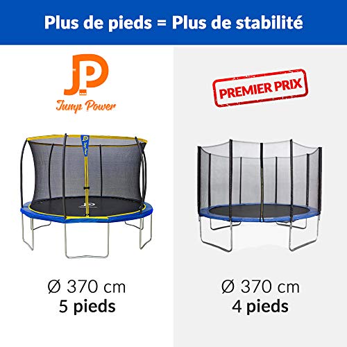 🛡️ Sécurité Renforcée à cause Vos Enfants La sécurité est une priorité avec le Jumpower. Le filet intérieur empêche l’accès aux ressorts, éliminant ainsi tout risque de chute entre les ressorts ou d’impact limitrophe le cadre. Les poteaux concaves maintiennent le filet à distance, offrant une protection supplémentaire en cas de chute limitrophe le filet.