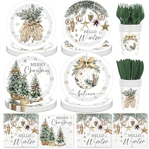144Pcs Merry Christmas Paper Plates and Napkins -Snowflake Christmas Tree Bell Dinnerware Set for Hello Winter Holiday Xmas Party Supplies
